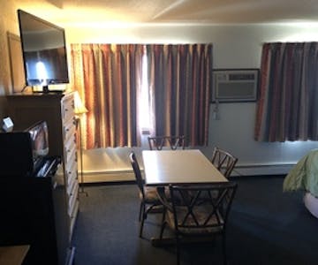 This is a Jacuzzi Suite with the Jacuzzi in living room and separate bathroom. Comes with Flat Screen T.V. with cable, Fridge & Microwave, Table and Couch with pull out bed